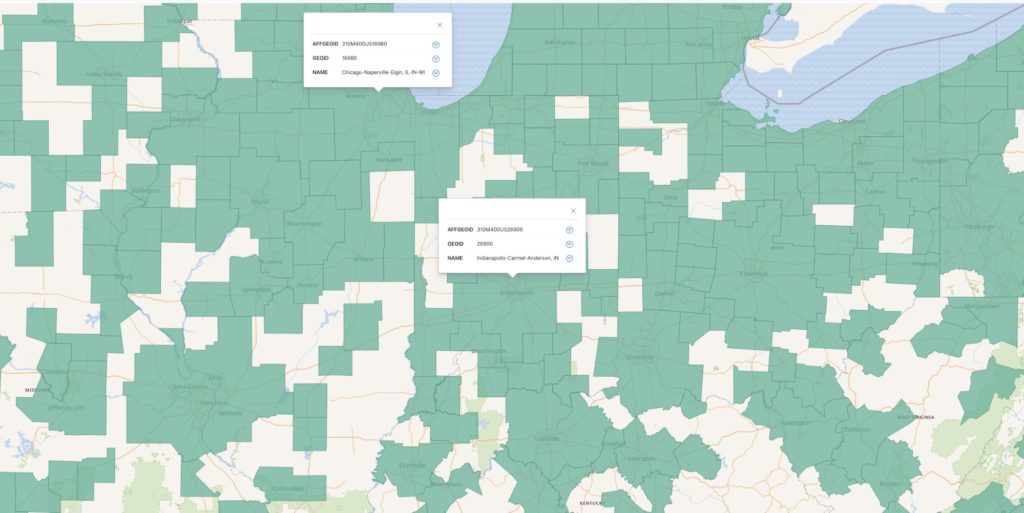Zoomed in on the result, we get a sense of what exactly constitutes a metro area in the eyes of the Census Bureau. I added some tooltip fields using the Tooltip Fields in the layer editor.