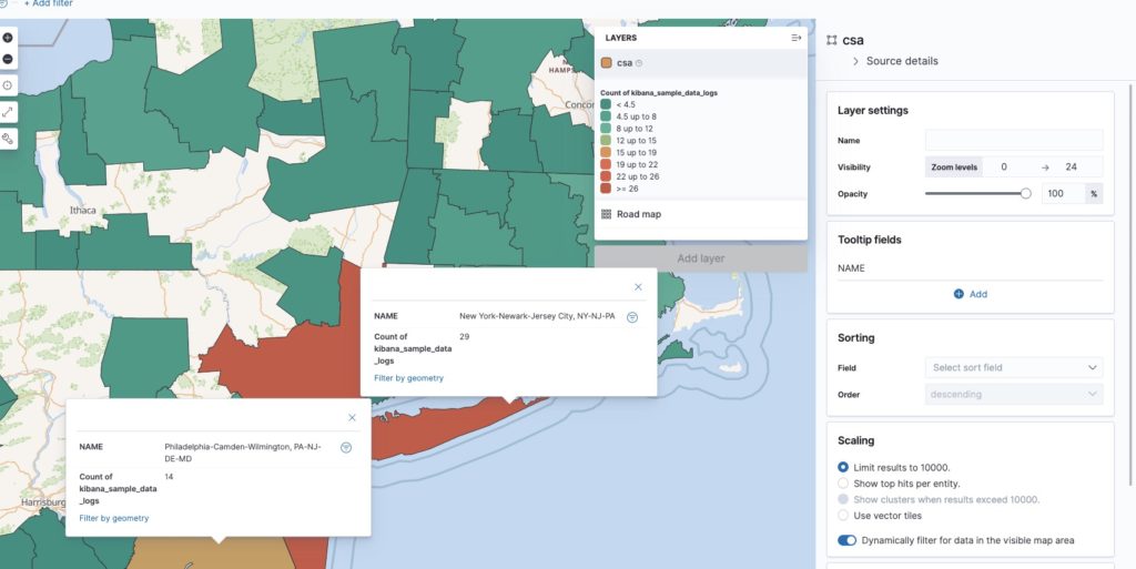 Elastic Maps come with a lot of great region options so you can get started quickly, but it also offers the ability to easily map your own regions. You can use any boundary data you’d like for this, as long as you have source data that contains a longitude and latitude.
